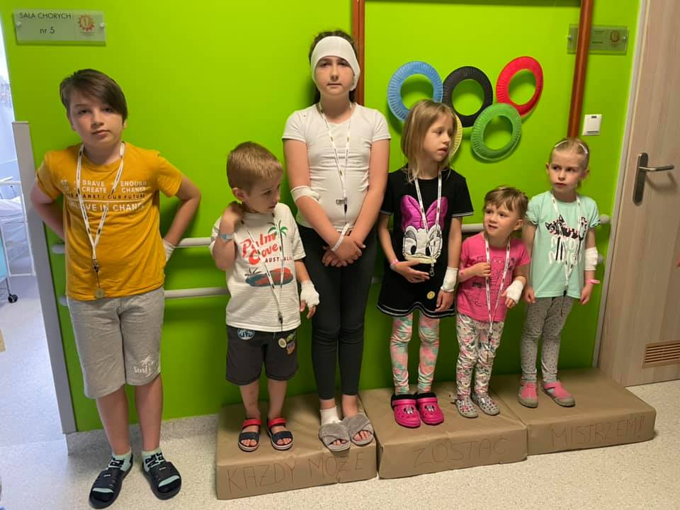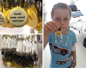 Dużym zainteresowaniem cieszyła się koszykówka – bardzo dużo dzieci i rodziców postanowiło zostać mistrzami wrzucania piłki do kosza z różnej odległości. Okazało się oczywiście, że wszyscy to potrafią. Inną popularną dyscypliną była gra w piłkę nożną na szpitalnym korytarzu, ale nie taka zwyczajna tylko ze specjalnie przygotowanym torem przeszkód. Do tego zadania też ustawiły się długie kolejki ochotników. I wygląda na to,że wśród uczestników konkurencji znalazło się wielu przyszłych wybitnych piłkarzy. Osoby lubiące wyzwania wzięły udział w biegu z przeszkodami, w czasie którego dużo się działo. Było slalom, rzucanie piłeczką do celu, poruszanie się wyznaczonym szlakiem w określony sposób i sporo innych wyzwań. W tej dyscyplinie również ujawniło się wielu przyszłych maratończyków. Na podłogach oddziałowych korytarzy równie dobrze grało się w golfa, tym bardziej, że odbywało się to pod profesjonalnym okiem państwa Marii i Kazimierza Mitukiewiczów golfistów Mazury Golf & Country Club w Naterkach, którzy przyjęli nasze zaproszenie do wspólnej zabawy. Gorąco im za to dziękujemy. Ciekawe, ile osób załapało dzięki temu golfowego bakcyla i odkryło swoje nowe powołanie. Wiele dzieci postawiło tego dnia także na intelektualną rywalizację i rozrywkę, grając ze sobą i swoimi nauczycielami w różne gry planszowe – największą popularnością cieszyło się m.in. Uno. Podołały również wyzwaniu i rozwiązały test z wiedzy o igrzyskach olimpijskich. Co wcale nie dziwi, bo patrząc na ich sportowe umiejętności, jesteśmy pewni, że znajdowali się wśród nich przyszli olimpijczycy. Trzymamy za to kciuki. A to,że nasi wychowankowie nie opadli z sił podczas sportowych wyczynów, było możliwe dzięki olsztyńskiej Polskiej Sieci Handlowej Lewiatan, która podarowała nam na tę okazję wodę i słodycze. Pamiętała również o najmłodszych pacjentach szpitala dziecięcego, przekazując chusteczki nawilżające, które poprawią komfort ich życia. Składamy za wszystkie te dary wielkie podziękowania. Jak wiadomo, za sukcesy z konkurencjach i zawodach otrzymuje się nagrodę. Wszystkie dzieci biorące udział w Dniu Dziecka otrzymały pamiątkowe medale, których zakup został sfinansowany przez MPEC Olsztyn. Medale bardzo się podobały, a ich wręczenie wywołało uśmiechy na ustach naszych wychowanków, ich rodziców i personelu medycznego. Bardzo dziękujemy przedsiębiorstwu MPEC Olsztyn za hojność, która umożliwiła uszczęśliwienie naszych dzieci w dniu ich święta.