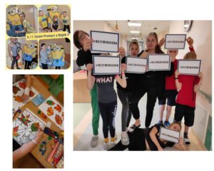 W tym miesiącu wyraziliśmy swoje poparcie dla akcji #hejtminiegra. Mieliśmy też wyjątkowego gościa. Z okazji Dnia Postaci z Bajek odwiedził nas Minionek, z którym chętnie zrobiliśmy sobie pamiątkowe zdjęcia. Było to możliwe dzięki Marcie Pszczółkowskiej – bardzo Jej za to dziękujemy. Zrelaksowani wizytą bajkowej postaci, mogliśmy się z zapałem zabrać do różnych przyjemnych listopadowych działań. A trochę ich było. Ponieważ zauważyliśmy, że większość drzew zgubiła swoje liście, szybko przygotowaliśmy im nowe. Nie wiemy, czy drzewom się spodobały, ale nam bardzo. Uroczyście obeszliśmy Narodowe Święto Niepodległości i Dzień Patrona Szkoły. Szczegółowe relacje z tych wydarzeń znajdują się na naszej stronie internetowej i Facebook.