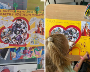 Po chwilach beztroskiej zabawy pojawiły się też te bardziej refleksyjne i podniosłe. Uczciliśmy kolejną rocznicę wizyty Jana Pawła II w naszym szpitalu. Z tej okazji przypomnieliśmy sobie jej przebieg i wykonaliśmy okolicznościowe plakaty.