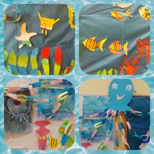 Dalsza część miesiąca upłynęła nam równie przyjemnie. Świętując Światowy Dzień Oceanów, dowiedzieliśmy się, jak ważne są one dla naszej planety i jak je chronić. Wykonaliśmy też papierowe akwarium z podwodnymi stworzeniami. Na innych zajęciach rysowaliśmy meduzy. Wiecie, jakie mają ładne chociaż groźne parzydełka? Obchodziliśmy też inny ważny dzień – Dzień Ojca. Z tej okazji złożyliśmy naszym ukochanym tatusiom życzenia, wykonaliśmy dla nich piękne kolorowe krawaty i namalowaliśmy ich portrety.